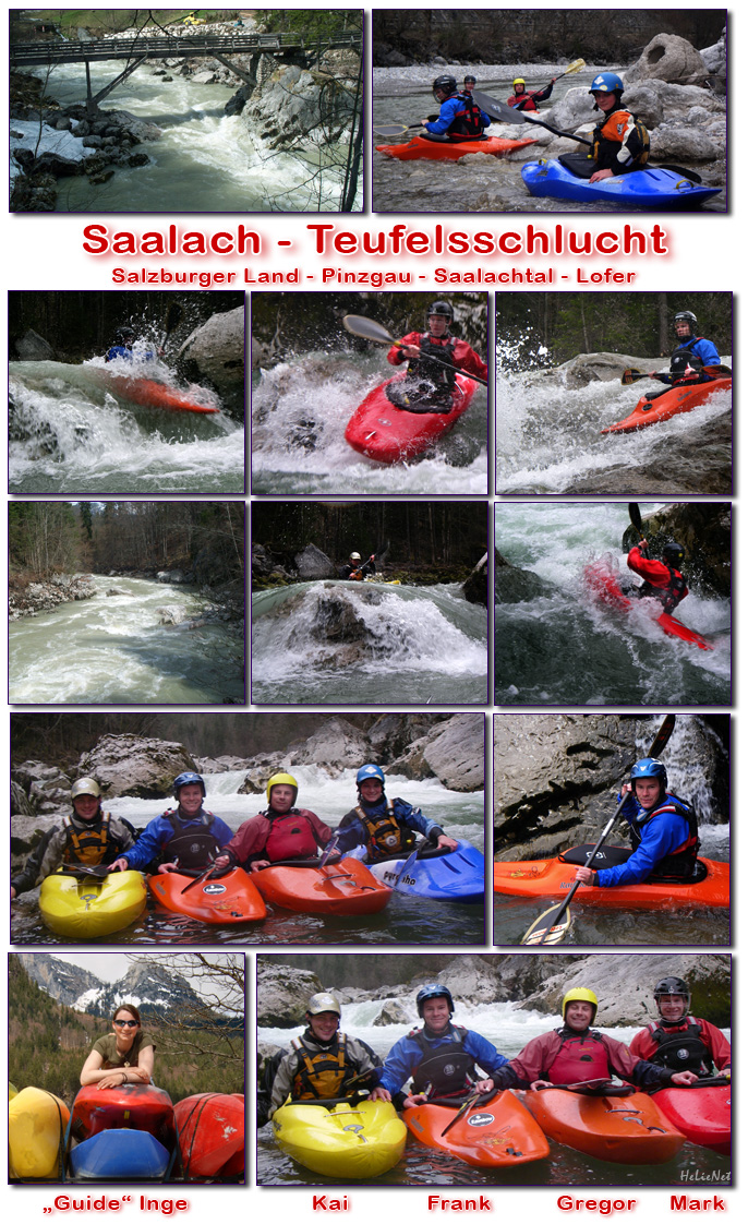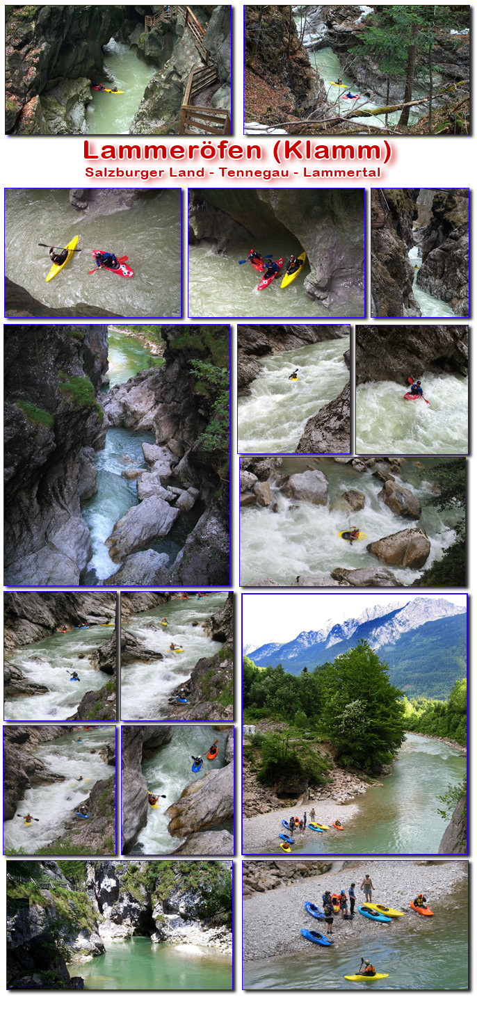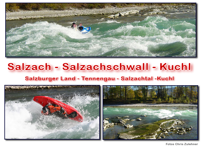 Möchte man mehr - viel mehr - ja dann sollte man in die Alpen reisen. Da wir Freunde in Abtenau haben, bietet sich das Gebiet um Abtenau mit den Flüssen Lammer, Salzach, Saalach und Taugel an. ![]() In meiner Jugendzeit bin ich zum Wildwasser - Paddeln gekommen, wie meine Söhne habe auch ich meine erste Erfahrung auf der Erft gemacht, und mein erstes richtiges Wildwassererlebnis hatte ich auf der Lammer. Das war Anfang der 70ziger Jahre. Wir sind in einer Gruppe, Teilstrecken der Lammer gepaddelt, aber ohne die Lammeröfen. Heute paddeln die Söhne Frank und Mark auch auf der Lammer, die aber bevorzugen den Teilabschnitt "Lammeröfen", Aktion ist angesagt. Die Beiden haben von Inge, einer WW Expertin sehr viel gelernt. Zur notwendigen Technik auch das richtigen Verhalten besonders im Bezug zur aktiven und passiven Sicherheit. Es gilt: lieber einmal den Mut aufbringen und eine Strecke nicht fahren, anstatt sich unnötigen Gefahren auszusetzen. ![]() Der Kuchler Salzachschwall. In der Nähe der Gemeine Kuchl, befindet sich auf der Salzach eine der besten und bekanntesten Spielwellen in Österreich. Diese Surfwellen locken viele Kanuten nach Kuchl, ins Salzburger Land. ![]() Taugl - Römerfall Kuchl ist den meisten Paddlern